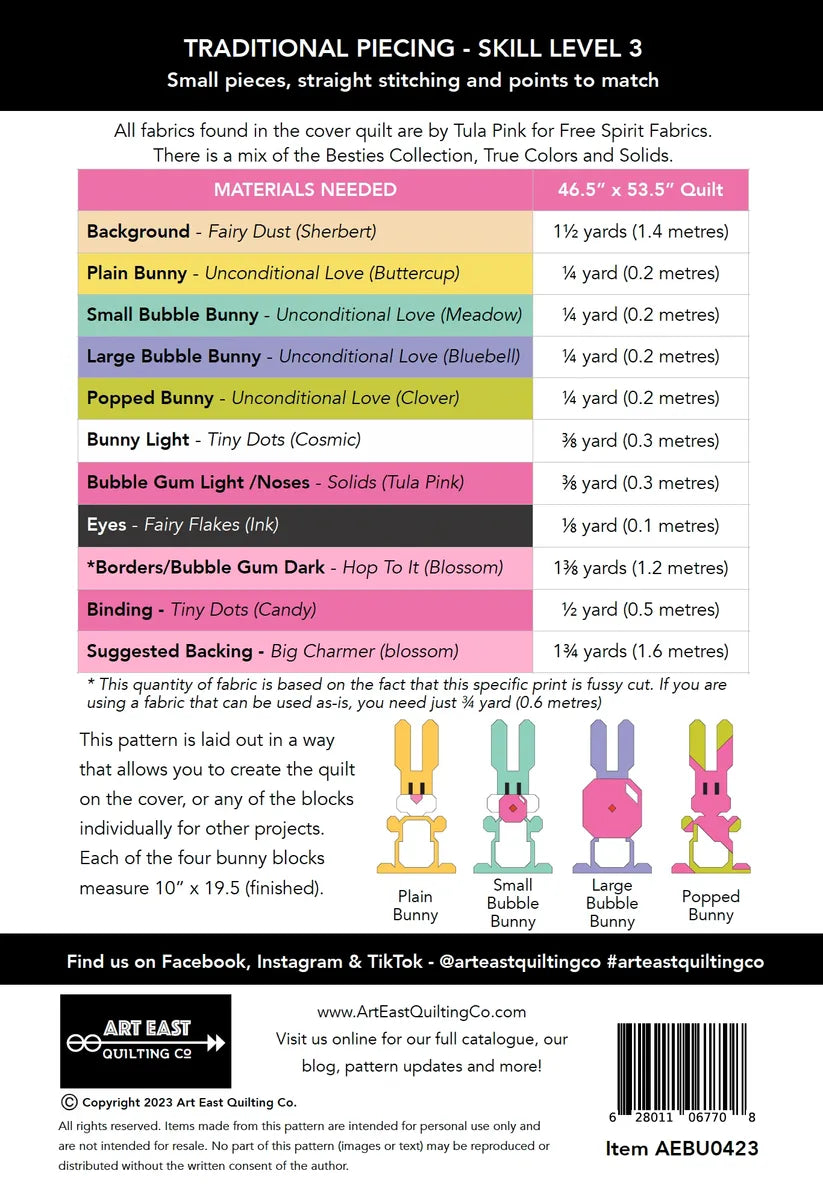 Blowing Up Bunnies - Rabbits Chewing Gum - BESTIES EDITION includes complete instructions for making the 46.5” x 53.5” quilt (as seen on the cover) or individual bunny blocks for smaller projects. The individual blocks each measure 10” x 19.5” and include a plain bunny block, a bunny blowing a small bubble, a bunny blowing a large bunny and a bunny whose bubble popped all over them! This project is designed using conventional piecing techniques (no paper-piecing). A cutting guide layout diagram is included to help you make the most of your background fabric for cutting.
