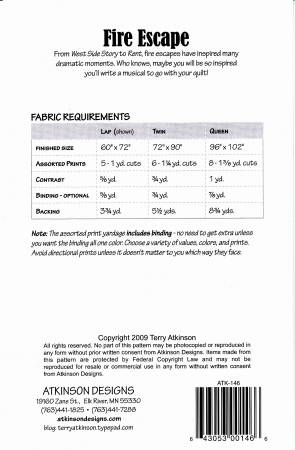 From "West Side Story" to "Rent", fire escapes have inspired many dramatic moments. Make this dramatic quilt using five 1 yd. cuts of fabric (lap size)! lap, twin, queen