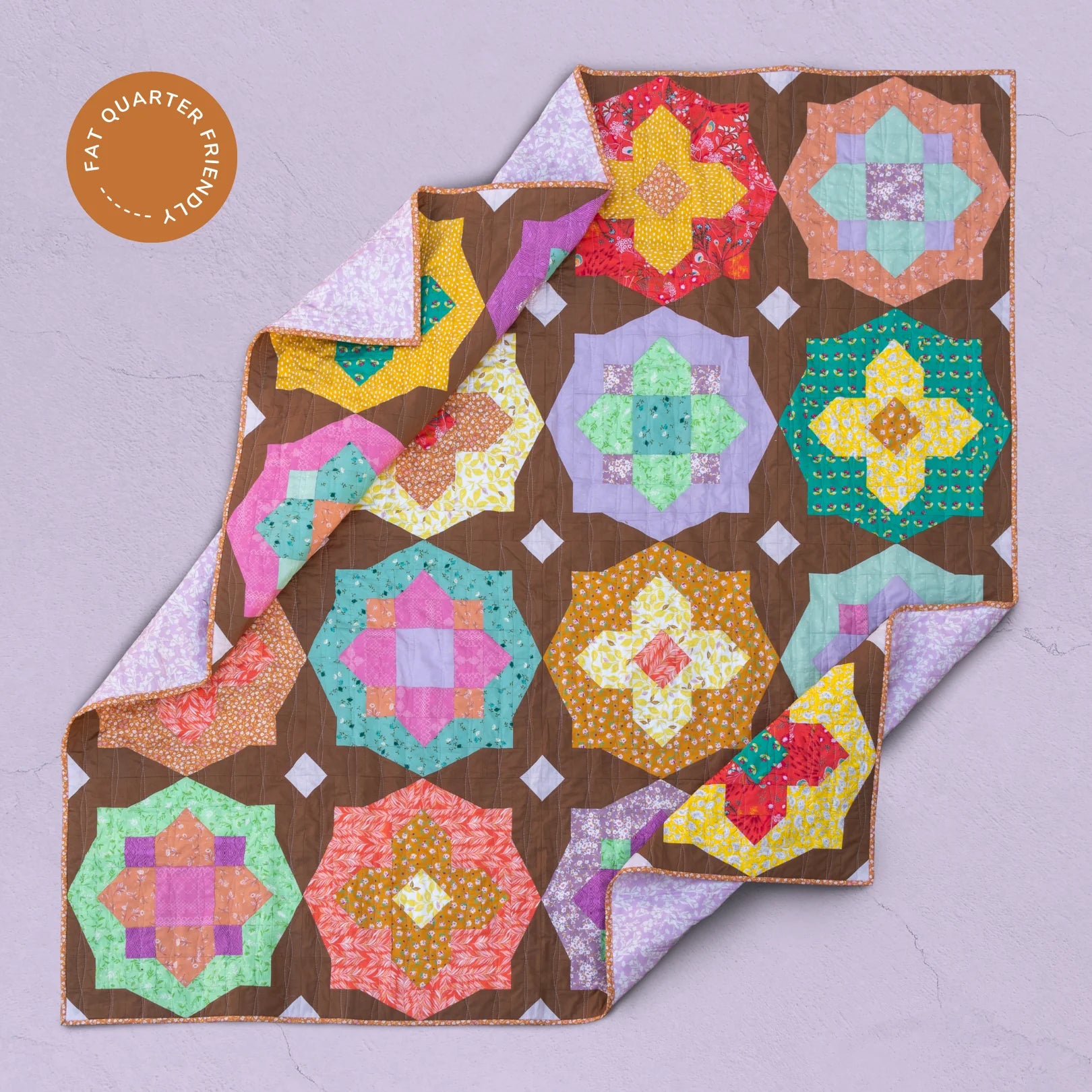 The Garden Glow Quilt is a spin-off design inspired by one of my best-selling and personal favorite patterns, the Sky Cabin Quilt. I wanted to push my creativity further by creating a block-based design that is fat-quarter friendly, drawing inspiration from my adoration for tile floors and intricate mosaics.