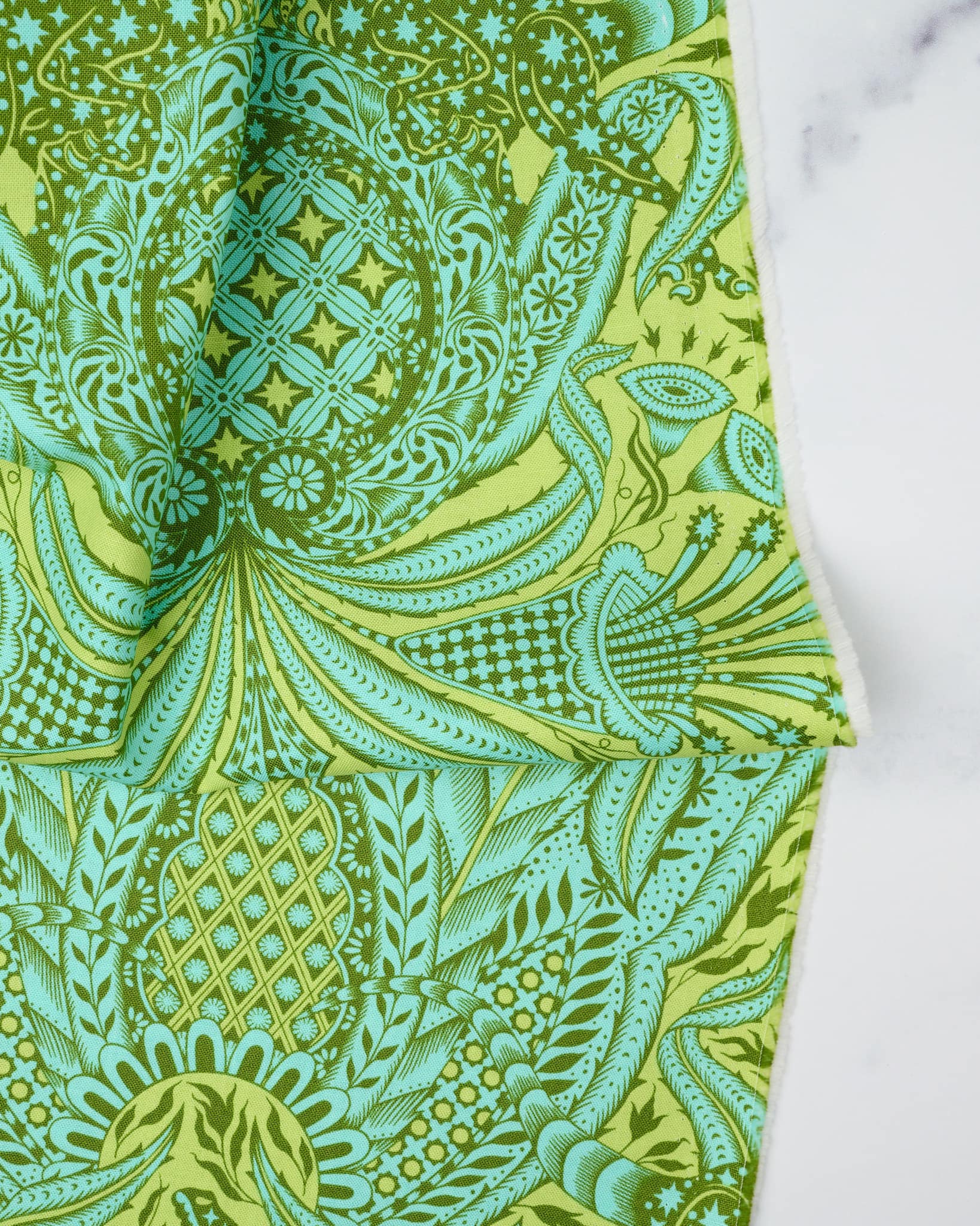 Everything that I do as a fabric designer is about indulging my childhood fantasies. I try to hold on to all of the things that we so easily let go of as we grow up like wonder, amazement, creative logic and delight. Typically, dinosaur fabrics are for children and I don't know who made that decision but I wildly disagree. Roar! is whimsical take on fancy dinosaurs for those of us who keep one foot firmly planted in fantasy. My prehistoric landscape is drenched in details and color. Here you will find a sophisticated T-Rex in a topiary, A Triceratops out for a stroll on a windy parkway path, Happy little hidden Raptors in a dainty damask and Pterodactyls taking time to smell the flowers. It's just your average lazy afternoon in the garden with the giants of Earth's history.