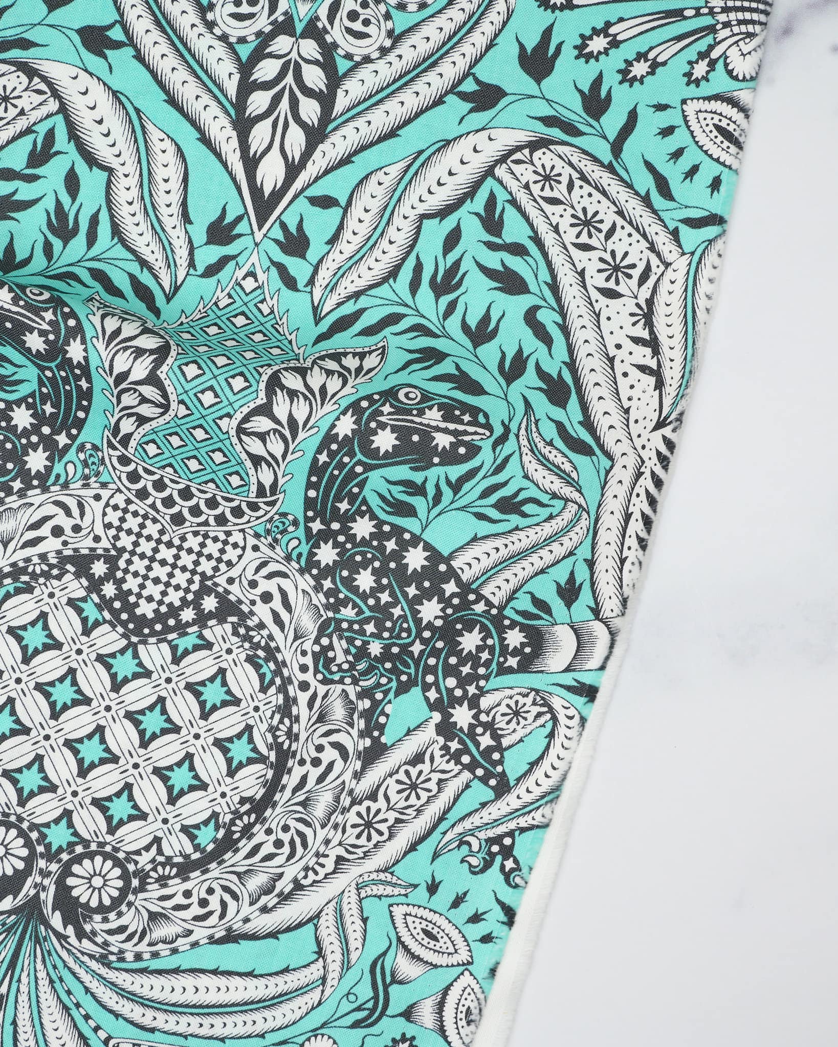 Everything that I do as a fabric designer is about indulging my childhood fantasies. I try to hold on to all of the things that we so easily let go of as we grow up like wonder, amazement, creative logic and delight. Typically, dinosaur fabrics are for children and I don't know who made that decision but I wildly disagree. Roar! is whimsical take on fancy dinosaurs for those of us who keep one foot firmly planted in fantasy. My prehistoric landscape is drenched in details and color. Here you will find a sophisticated T-Rex in a topiary, A Triceratops out for a stroll on a windy parkway path, Happy little hidden Raptors in a dainty damask and Pterodactyls taking time to smell the flowers. It's just your average lazy afternoon in the garden with the giants of Earth's history.