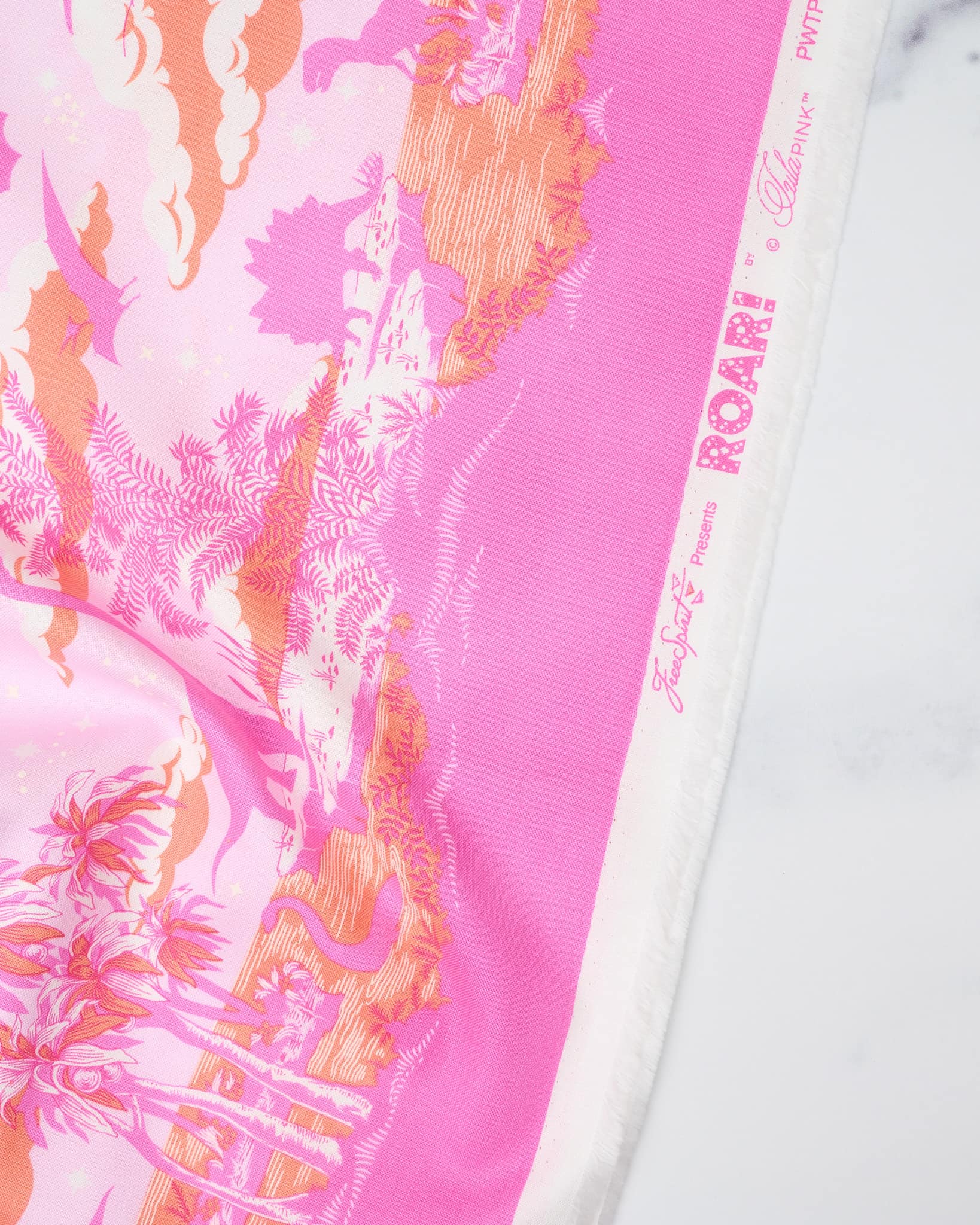 Everything that I do as a fabric designer is about indulging my childhood fantasies. I try to hold on to all of the things that we so easily let go of as we grow up like wonder, amazement, creative logic and delight. Typically, dinosaur fabrics are for children and I don't know who made that decision but I wildly disagree. Roar! is whimsical take on fancy dinosaurs for those of us who keep one foot firmly planted in fantasy. My prehistoric landscape is drenched in details and color. Here you will find a sophisticated T-Rex in a topiary, A Triceratops out for a stroll on a windy parkway path, Happy little hidden Raptors in a dainty damask and Pterodactyls taking time to smell the flowers. It's just your average lazy afternoon in the garden with the giants of Earth's history.
