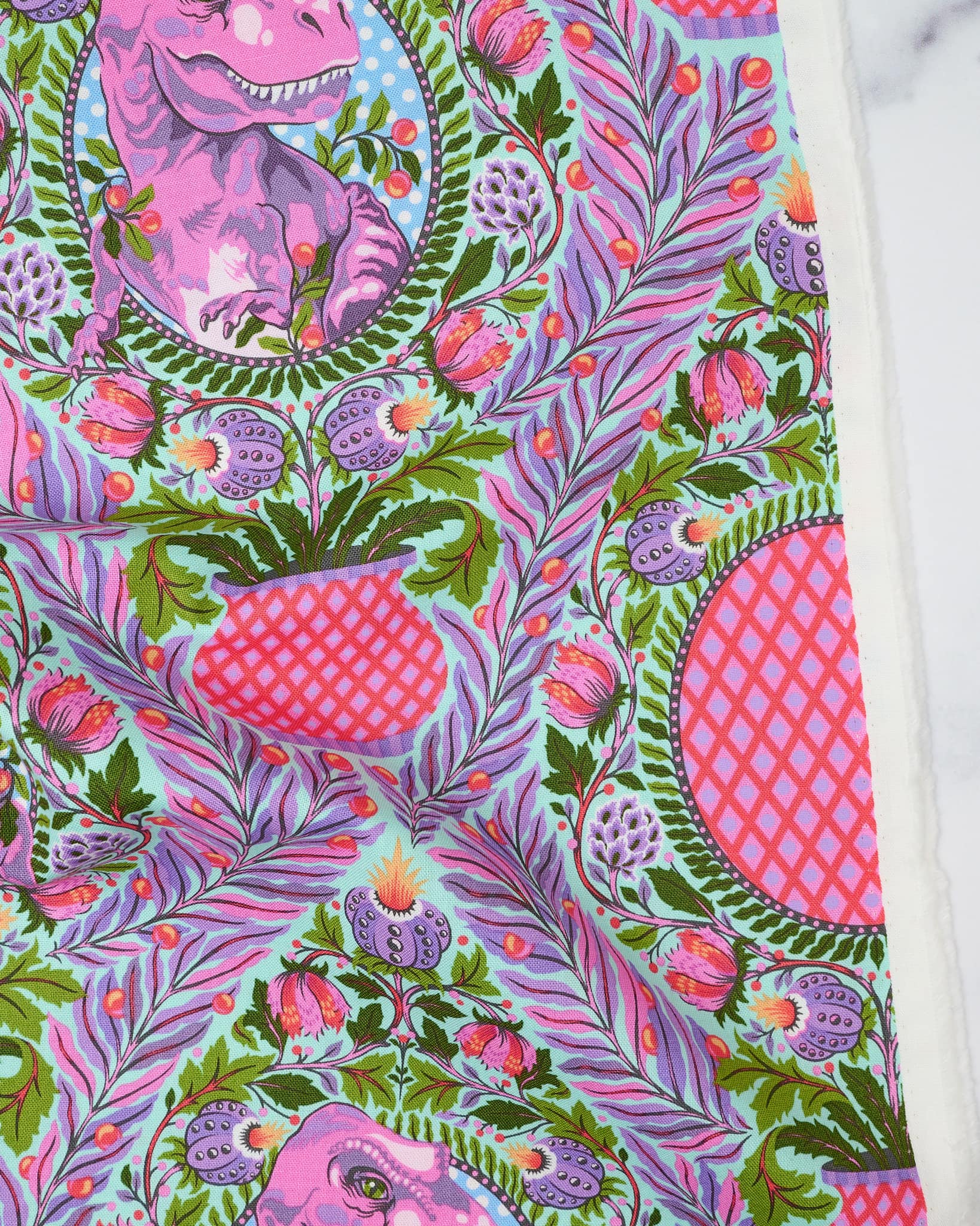 Everything that I do as a fabric designer is about indulging my childhood fantasies. I try to hold on to all of the things that we so easily let go of as we grow up like wonder, amazement, creative logic and delight. Typically, dinosaur fabrics are for children and I don't know who made that decision but I wildly disagree. Roar! is whimsical take on fancy dinosaurs for those of us who keep one foot firmly planted in fantasy. My prehistoric landscape is drenched in details and color. Here you will find a sophisticated T-Rex in a topiary, A Triceratops out for a stroll on a windy parkway path, Happy little hidden Raptors in a dainty damask and Pterodactyls taking time to smell the flowers. It's just your average lazy afternoon in the garden with the giants of Earth's history.