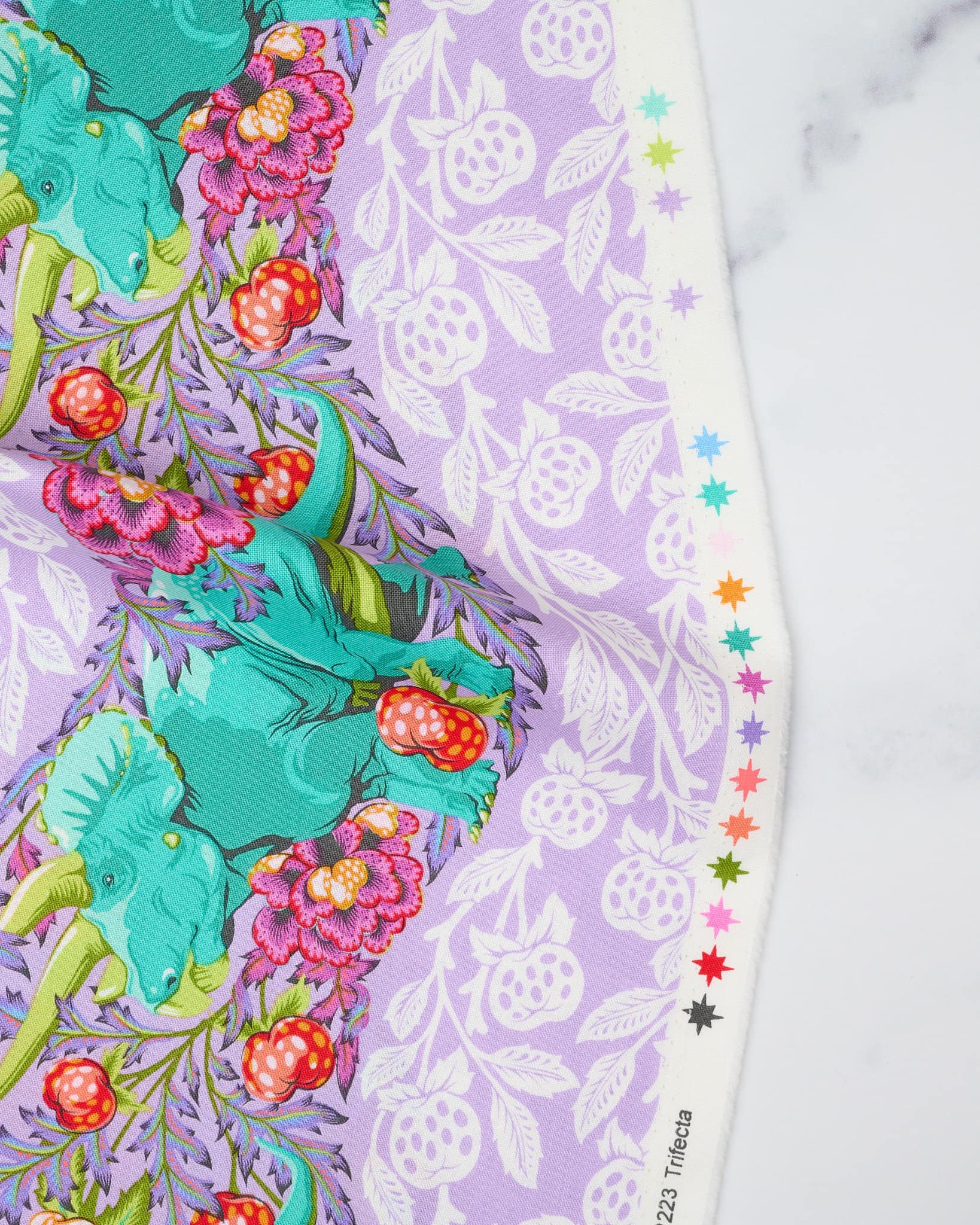 Everything that I do as a fabric designer is about indulging my childhood fantasies. I try to hold on to all of the things that we so easily let go of as we grow up like wonder, amazement, creative logic and delight. Typically, dinosaur fabrics are for children and I don't know who made that decision but I wildly disagree. Roar! is whimsical take on fancy dinosaurs for those of us who keep one foot firmly planted in fantasy. My prehistoric landscape is drenched in details and color. Here you will find a sophisticated T-Rex in a topiary, A Triceratops out for a stroll on a windy parkway path, Happy little hidden Raptors in a dainty damask and Pterodactyls taking time to smell the flowers. It's just your average lazy afternoon in the garden with the giants of Earth's history.