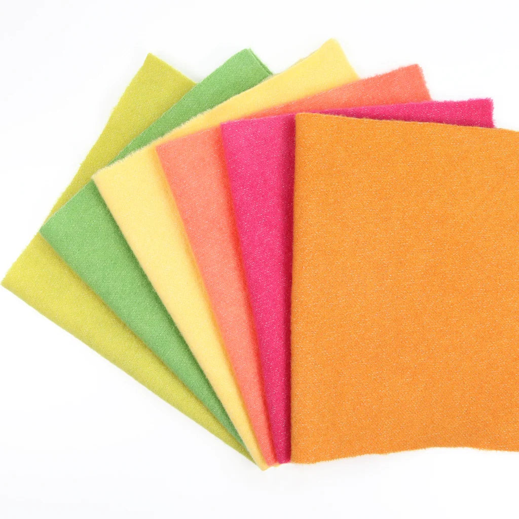 - Includes our hand dyed sparkle wool in 6 shades: Spring Leaf, Peridot, Creamed Butter, Kumquat, Raspberry, Mango