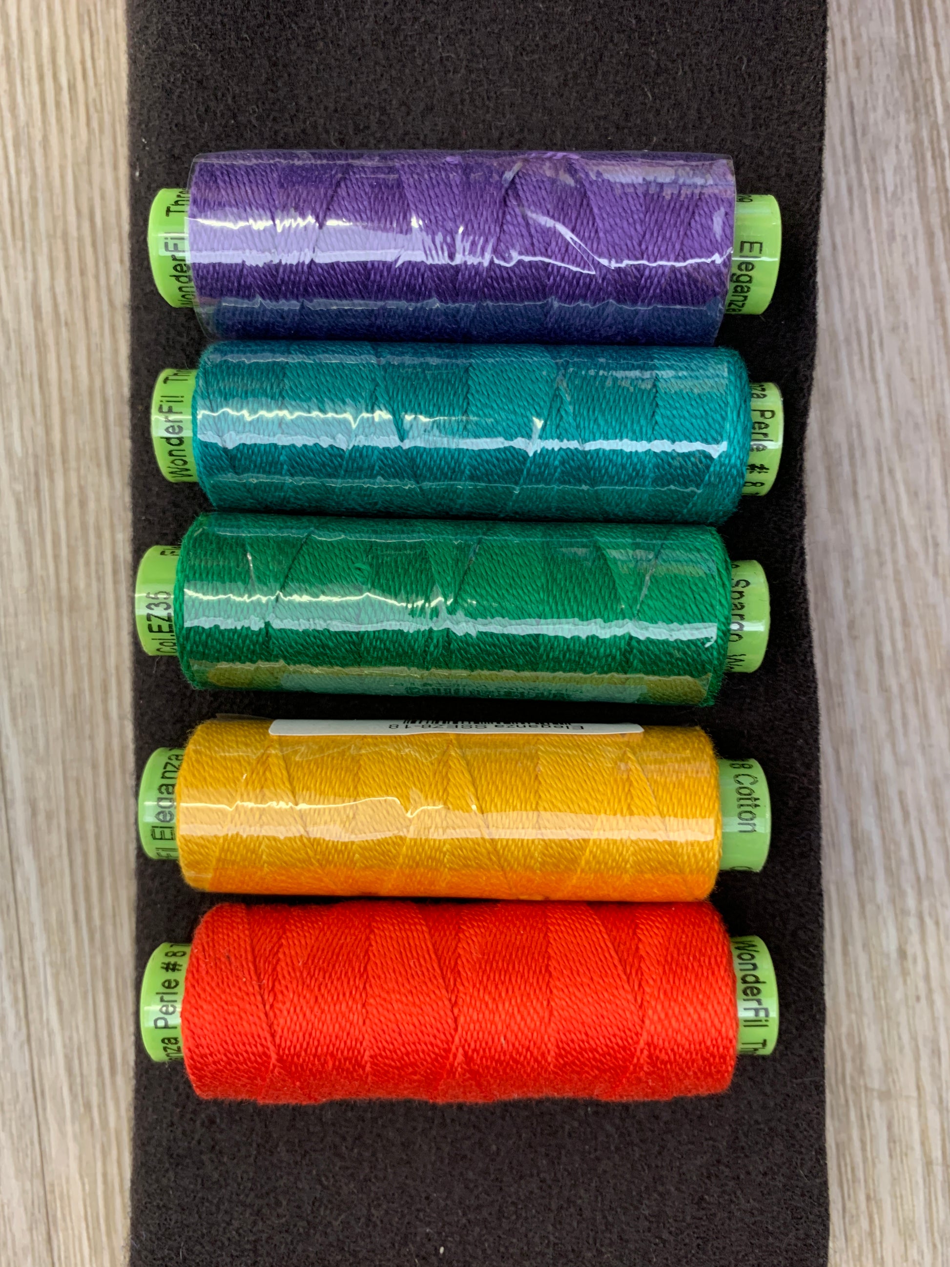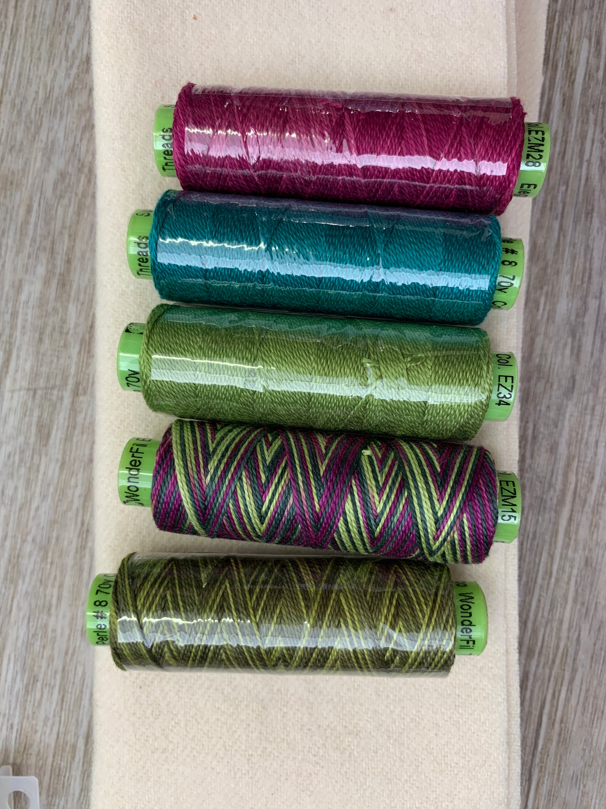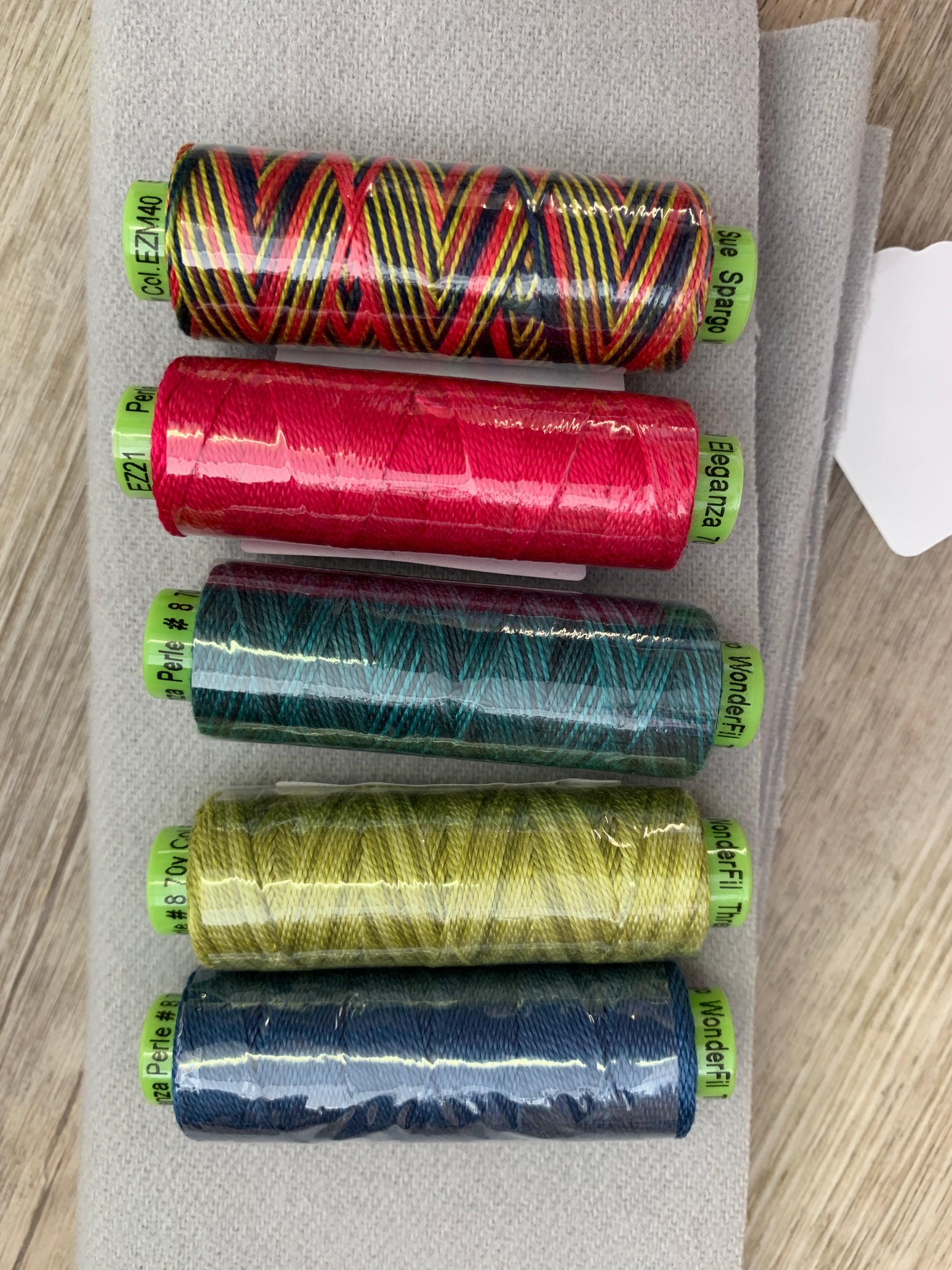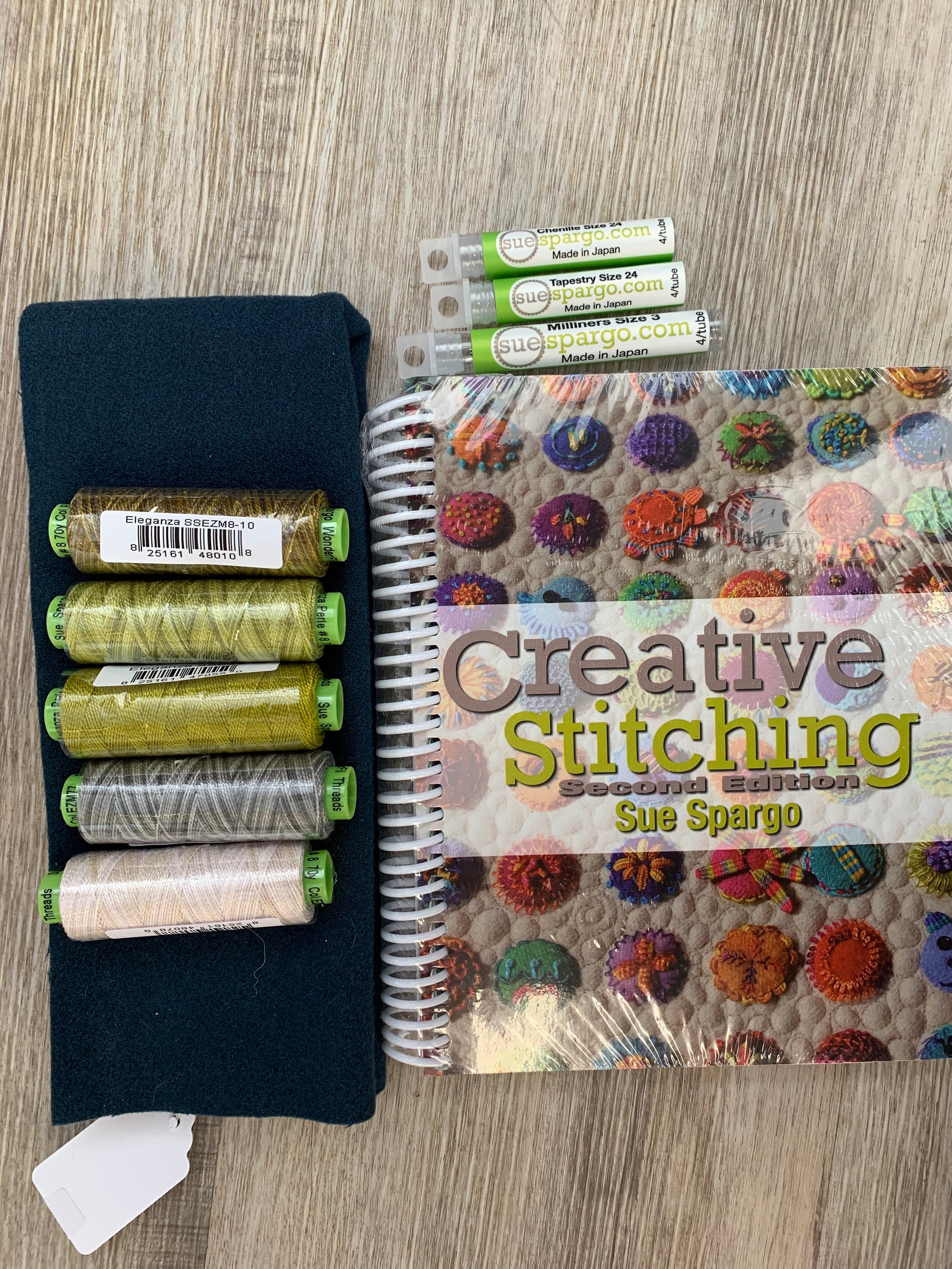 Each kit includes one fat eighth of wool, five Eleganza Pearle cotton embroidery threads, Sue Spargo's Creative Stitching book, Milliners Size 3 needles, Chenille Size 24 Needles, and Tapestry Size 24 needles. Save when you purchase together!