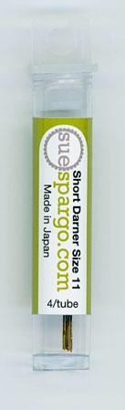 Sue's exclusive Short Darner size 11 needle - the ultimate balance between strength and flexibility. Made in Japan, the exceptional quality of these needles is incomparable. With a gold, slightly longer eye, threading these needles is a breeze. Double polished for superior performance, along with their extremely sharp point, needle-turn appliqué of cottons, silks, velvets, linen and other specialty fabrics becomes effortless.