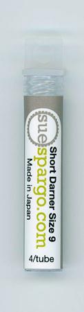 Sue's new Short Darner size 9, is the ultimate balance between strength and flexibility. Made in Japan, the exceptional quality of these needles is incomparable. With a gold, slightly longer eye, threading these needles is a breeze. Double polished for superior performance, along with their extremely sharp point, these needles make embroidery + beading stitches so easy!