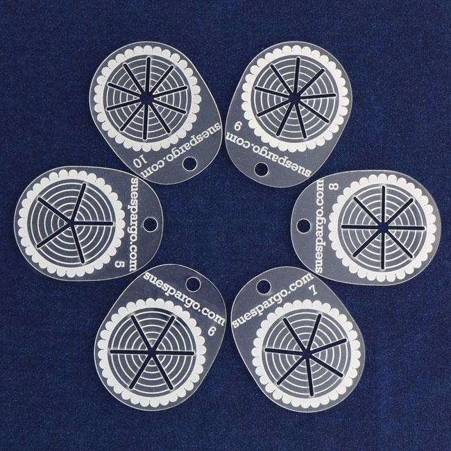 - There are five white circles connecting the spokes an 1/8" apart - these will help you keep all spokes the same size. Apply a small amount of pressure to keep the template in place. Choose a circle size for your stitch and place your chalk pencil inside the template's spoke at this point, then draw a line to the center.
