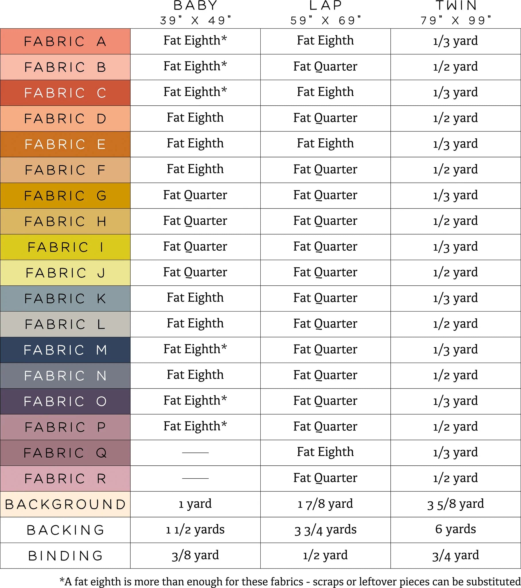 Baby 39" x 49", Lap 59" x 69", Twin 79" x 99"