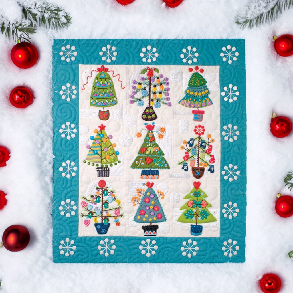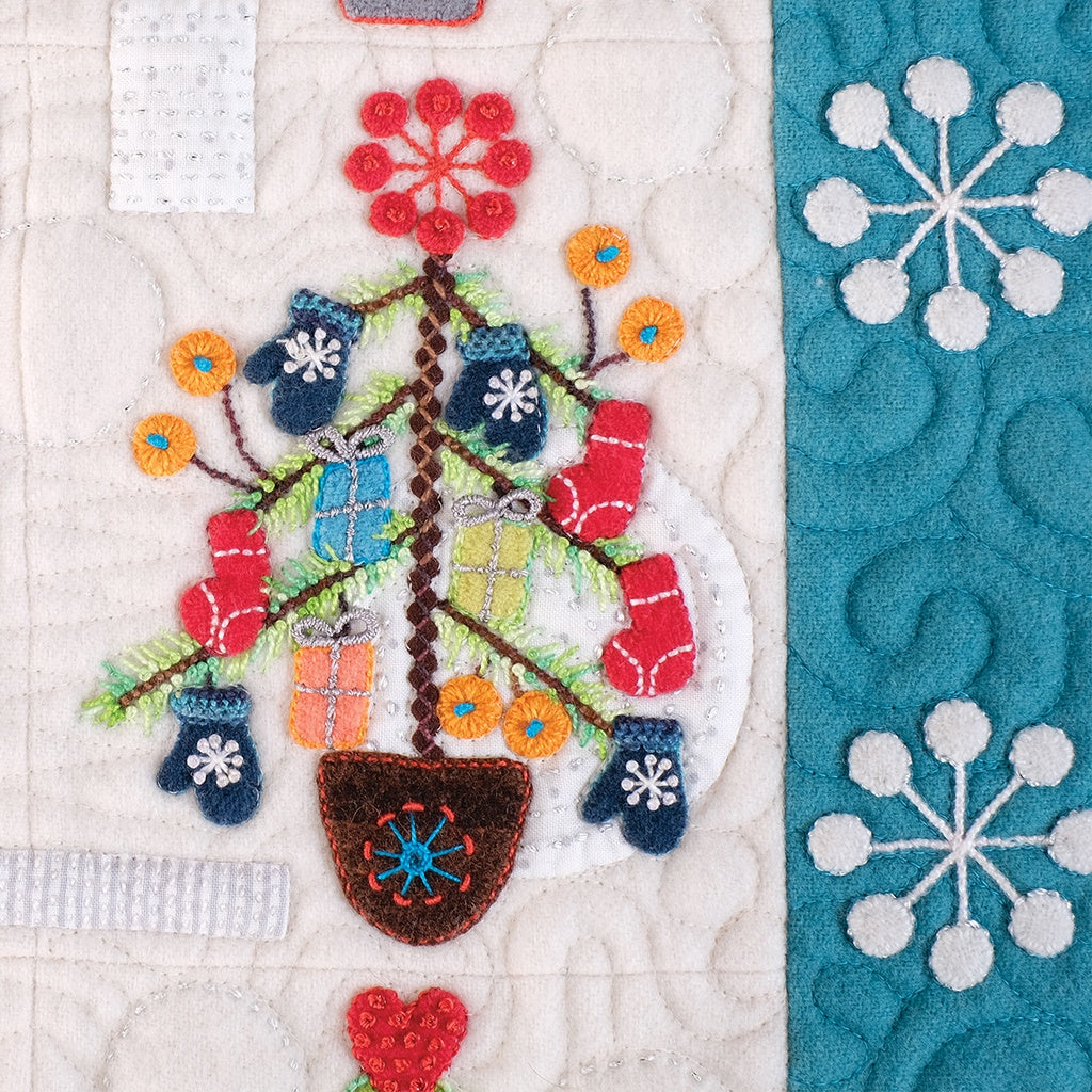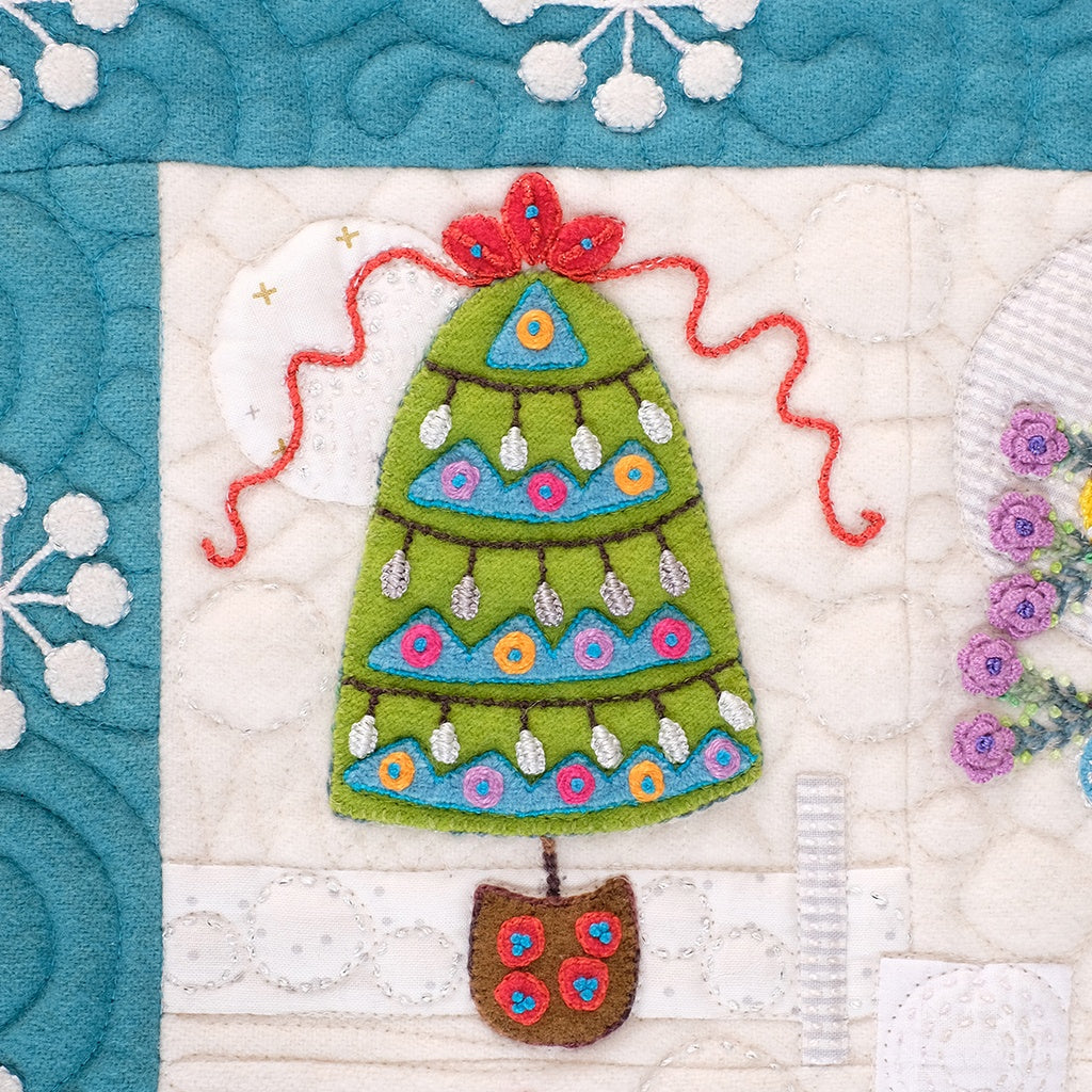 Sue's latest small study masterpiece celebrates the magic of Christmas trees. Each tree shows off its unique personality through dazzling decor such as festive lights, brightly colored baubles, and adorable little mittens and stockings. The soft white on white background allows the colorful trees to shine with cheer and the blue border adorned with cascading snowflakes wraps up it all up with a bow. Learn basic background layering techniques for cotton fabrics, plus sneaky tricks to make cotton applique a walk in the park! You'll add some extra love to your Tinsel quilt with textural background stitching, and you'll learn to enhance elements with masterfully chosen embroidery stitches.
