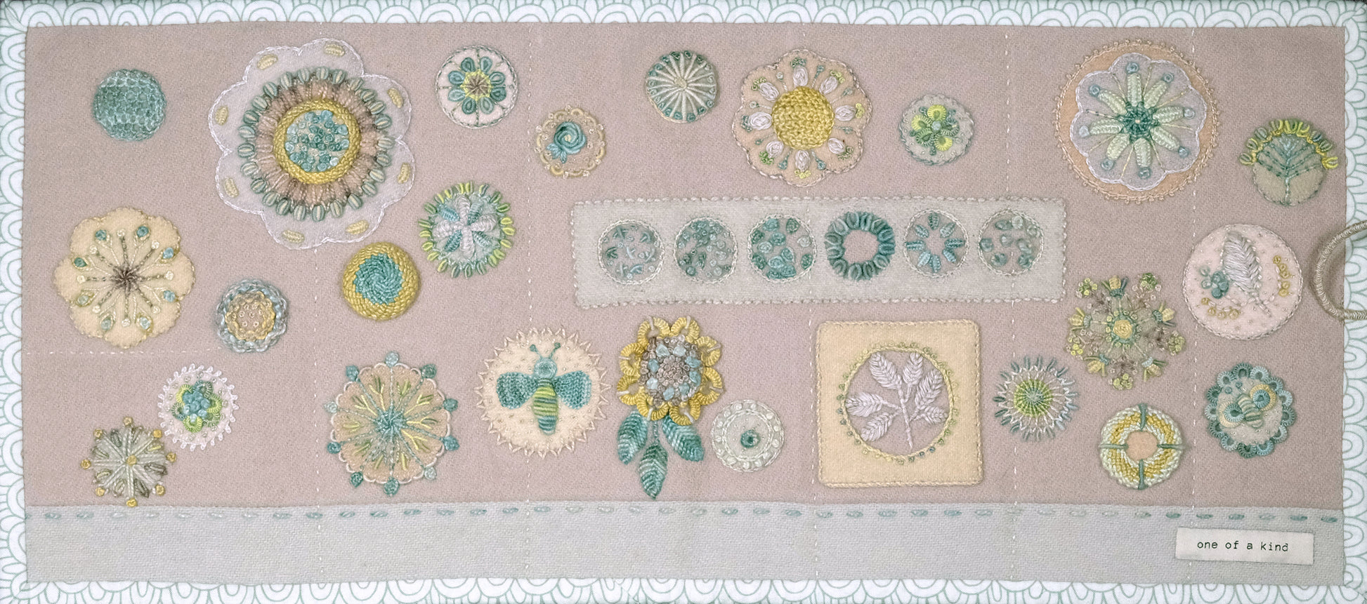Take an explorative study in combining embroidery stitches with this breath taking needle roll. Sue will assist you through minimally layering the background with applique, then provide a lesson on utilizing positive and negative space. Learn how to mix various types of threads and colors harmoniously and utilize embroidery stitches in combinations to create amazing texture, dimension and graphics.