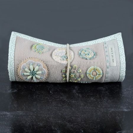 Kit includes: hand dyed wool for front, back and applique, cotton fabric for interior pocket and binding, vanilla zipper, micro suede for zipper pull, elastic cording, tape measure jacquard ribbon, rick rack, "one of a kind" label, cork needle patches, Sue Spargo needle nanny, complementary pattern. (Due to limited availability, some fabrics may be substituted.)