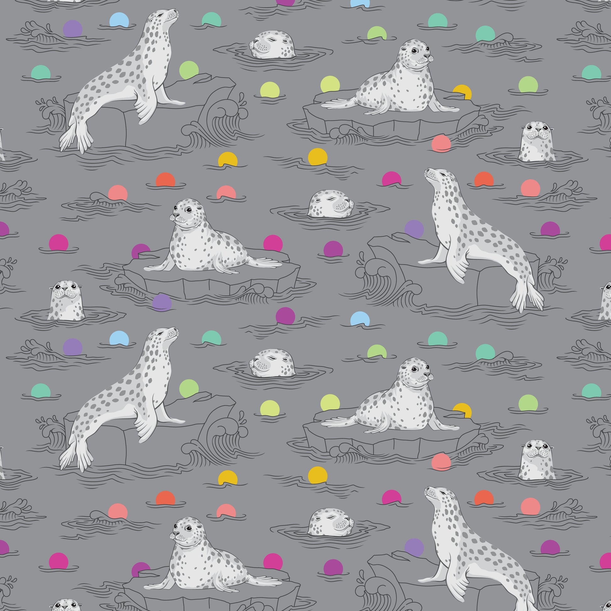 From Tula; Graywork is a follow up to my black and white collection titled “Linework” from 2020. This is a neutral collection designed in various shades of gray to fill the spaces between the rainbows. Graywork began as a collection of all gray prints and slowly blossomed to include touches of color to spice things up. I find it impossible to leave something completely void of color. For the main prints of the collection I focused on animals that live their lives in shades of gray; Wolves, Bears, Snow Leopards, Puffins and Sea Lions. These eight prints are big and illustrative packed with details deigned for fussy cutting as the stars of the show. The coordinating prints are variations on existing True Colors prints with some new pieces for texture. These might be the back up dancers to the hero prints but they are essential to connecting the prints and filling in the gradient or grays. The multi colored Stripe is back on both a soft gray and a charcoal gray ground and the Poms have been added to the party in a new rainbow version to coordinate with the stripes! You will find new medium and dark shades of Fairy Dust sprinkled in amongst the classic tonal grays for backgrounds and blending. The last thing that I felt this collection really needed was something that could act like a solid which came in the form of new Tiny Dots and a brand new print of tonal repeating triangles called “Kinda Shady”. While packed with artistic details this collection is designed, first and foremost to be useful. Leave it be or add in my other collections for maximum versatility.